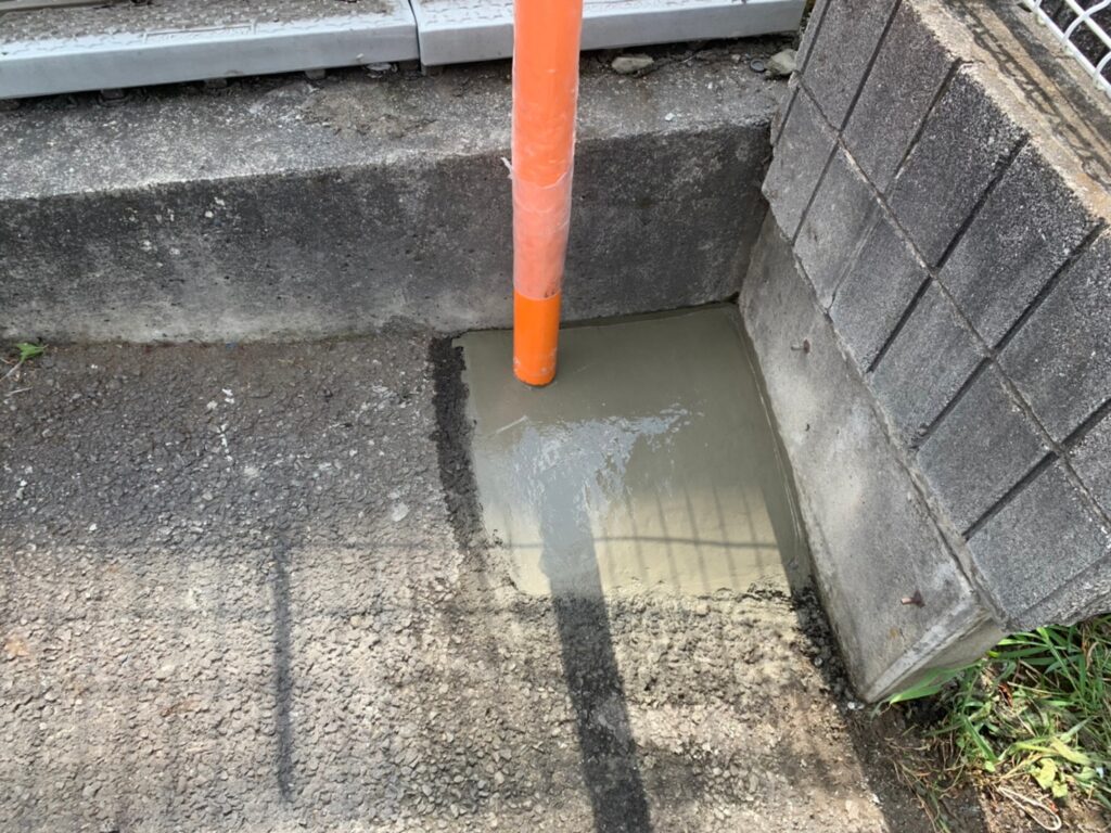 4枚目 施工後 水平を確認しながら1日おいてコンクリートを乾燥させ完成となります。こちらはカーブミラーの塗装まで行いました。