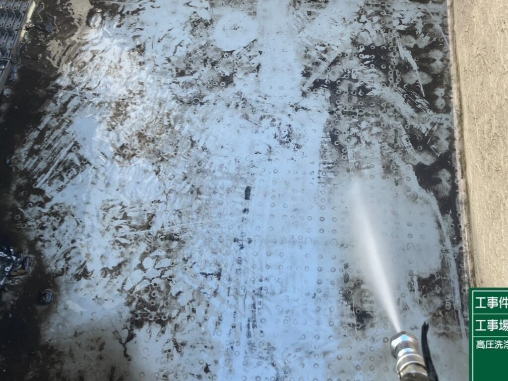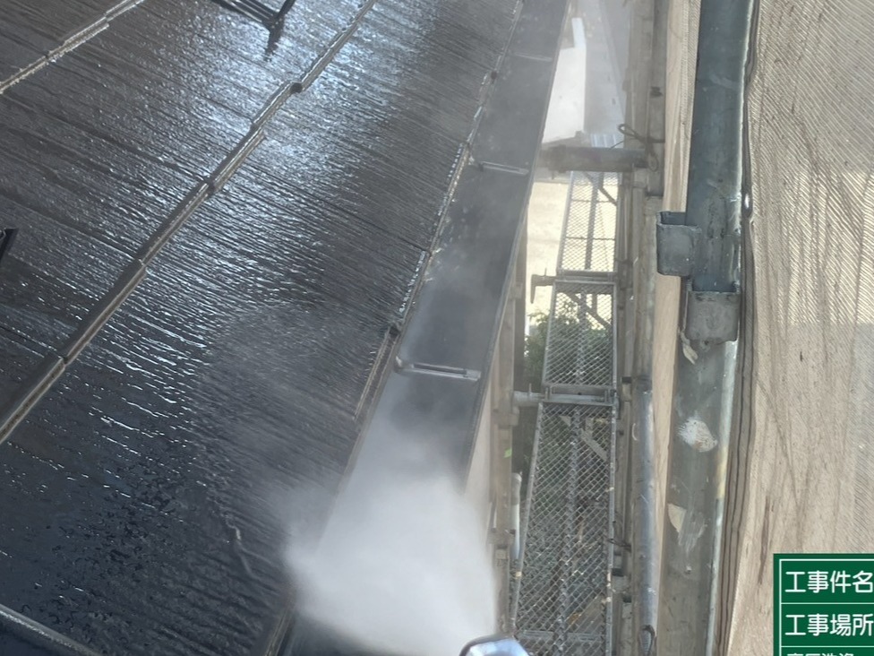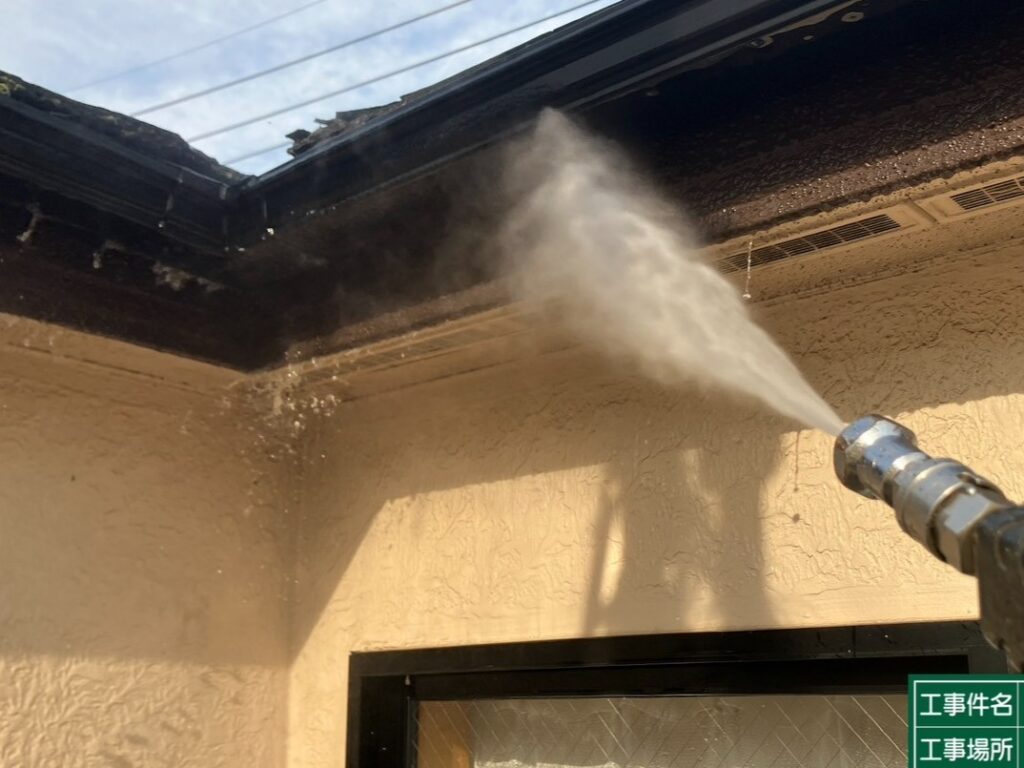高圧洗浄は、外壁だけでなく軒樋や敷地内の床も合わせて洗浄いたします。